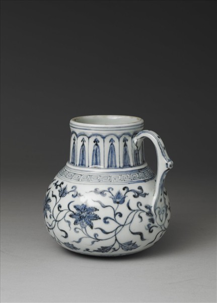 青花花澆。器口微侈,直頸,碩腹,如意形把連接頸腹,平底內凹成足。全器以釉下鈷藍釉繪飾。器頸部繪飾蓮瓣紋,頸腹間凸棱一圈,凸棱下一圈回紋飾帶,腹外壁繪飾纏枝花葉,等距裝飾的花卉大朵盛開,其上並見有「大明宣德年製」橫向單行六字楷款,腹外壁近底處卷草紋一圈。底露胎無款飾。這一種器形也見於伊斯蘭金屬器,或是當時受到伊斯蘭影響的作品。
