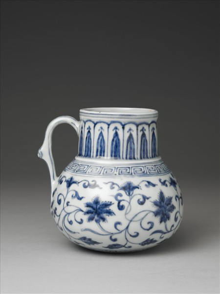 青花花澆。器口微侈,直頸,碩腹,如意形把連接頸腹,平底內凹成足。全器以釉下鈷藍釉繪飾。器頸部繪飾蓮瓣紋,頸腹間凸棱一圈,凸棱下一圈回紋飾帶,腹外壁繪飾纏枝花葉,等距裝飾的花卉大朵盛開,其上並見有「大明宣德年製」橫向單行六字楷款,腹外壁近底處卷草紋一圈。底露胎無款飾。這一種器形也見於伊斯蘭金屬器,或是當時受到伊斯蘭影響的作品。