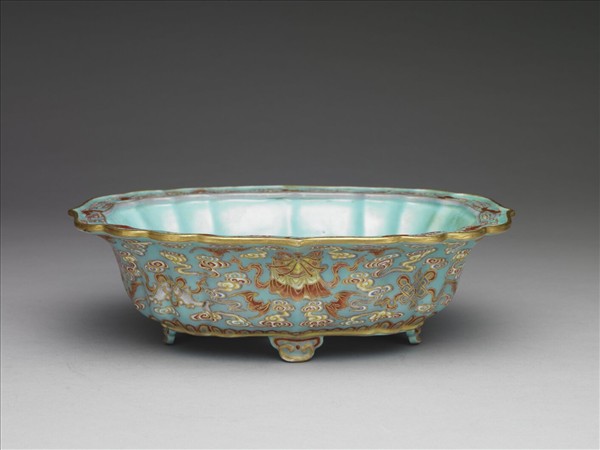 盆托呈橢圓,四瓣花形,出沿口。淺腹,腹形如鼓,平底、下承三雲頭形足。通體內外飾施藍地琺瑯彩,口沿鍍金,折沿處飾蝙蝠雲紋。器身以寶輪、寶螺、勝利幢、傘蓋、蓮花、寶瓶、雙魚、吉祥結,八吉祥飾之,襯以蝙蝠雲紋,腹部裝飾蕉葉紋,雲頭形足底施金彩。
