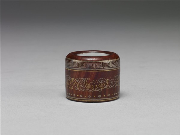 瓷扳指,外壁以黑、褐色彩釉繪製地紋,以摹仿木質紋理,其上再以金銀彩繪線描雲蝠紋、回紋及圈點紋,以仿嵌金銀絲的效果;內壁以硃紅篆書「乾隆年製」橫向單行四字款。中瓷4358-中瓷4375之各式扳指同儲於木匣中。乾隆官窯燒造的各類釉彩、各種形制及各式紋樣在造辦處中皆有檔案可追查,特別是釉彩一項,於歷年往返的文書中,透露出御窯廠同時生產與前朝風格相似及不同的作品。加上雍正六年至乾隆二十一年(1728-1756)以前,御窯廠的實際負責人皆為唐英,故從雍正、乾隆兩朝傳世品的異同中,頗能觀察出乾隆加諸官窯的影響,在他不定時的指導、參與之下,乾隆官窯創作出一種集大成的品味。此類作品有如收藏於北京故宮博物院的「各類釉彩瓷瓶」,以及此處的各種釉彩扳指,它們的尺寸雖有大、小的差異,功能亦有陳設和實用的不同,然而極致地表現追摹、仿燒的能力,最後將之改頭換面、再作包裝,正是乾隆官窯力圖誇耀技術、逞現能力的具體說明。