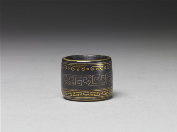 瓷扳指,外壁以黑釉為地,以摹仿黑色漆器質感,其上再以金銀彩繪線描回紋、如意點及雷紋,以仿嵌金銀絲的效果;內壁以金彩篆書「乾隆年製」橫向單行四字款。中瓷4358-中瓷4375之各式扳指同儲於木匣中。乾隆官窯燒造的各類釉彩、各種形制及各式紋樣在造辦處中皆有檔案可追查,特別是釉彩一項,於歷年往返的文書中,透露出御窯廠同時生產與前朝風格相似及不同的作品。加上雍正六年至乾隆二十一年(1728-1756)以前,御窯廠的實際負責人皆為唐英,故從雍正、乾隆兩朝傳世品的異同中,頗能觀察出乾隆加諸官窯的影響,在他不定時的指導、參與之下,乾隆官窯創作出一種集大成的品味。此類作品有如收藏於北京故宮博物院的「各類釉彩瓷瓶」,以及此處的各種釉彩扳指,它們的尺寸雖有大、小的差異,功能亦有陳設和實用的不同,然而極致地表現追摹、仿燒的能力,最後將之改頭換面、再作包裝,正是乾隆官窯力圖誇耀技術、逞現能力的具體說明。