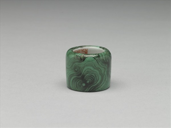 瓷扳指,外壁以黑、綠色彩釉繪製摹仿天然石材的色彩紋理;內壁以硃紅篆書「乾隆年製」橫向單行四字款。中瓷4358-中瓷4375之各式扳指同儲於木匣中。乾隆官窯燒造的各類釉彩、各種形制及各式紋樣在造辦處中皆有檔案可追查,特別是釉彩一項,於歷年往返的文書中,透露出御窯廠同時生產與前朝風格相似及不同的作品。加上雍正六年至乾隆二十一年(1728-1756)以前,御窯廠的實際負責人皆為唐英,故從雍正、乾隆兩朝傳世品的異同中,頗能觀察出乾隆加諸官窯的影響,在他不定時的指導、參與之下,乾隆官窯創作出一種集大成的品味。此類作品有如收藏於北京故宮博物院的「各類釉彩瓷瓶」,以及此處的各種釉彩扳指,它們的尺寸雖有大、小的差異,功能亦有陳設和實用的不同,然而極致地表現追摹、仿燒的能力,最後將之改頭換面、再作包裝,正是乾隆官窯力圖誇耀技術、逞現能力的具體說明。