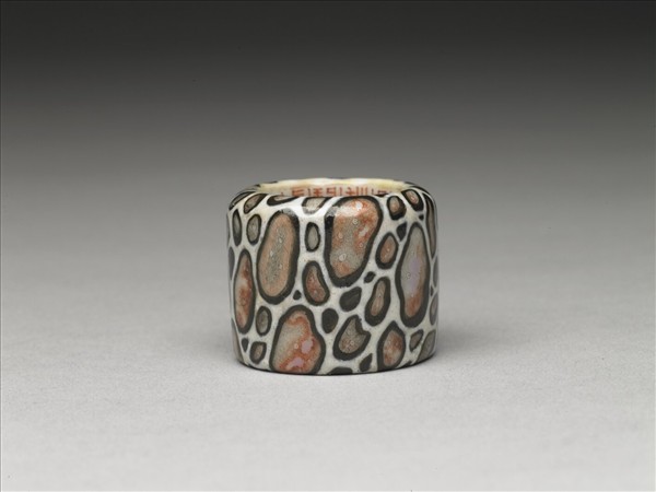 瓷扳指,外壁以多層次的紅彩、褐彩與黑彩釉繪製摹仿天然石材的色彩斑紋;內壁以硃紅篆書「乾隆年製」橫向單行四字款。中瓷4358-中瓷4375之各式搬指同儲於木匣中。乾隆官窯燒造的各類釉彩、各種形制及各式紋樣在造辦處中皆有檔案可追查,特別是釉彩一項,於歷年往返的文書中,透露出御窯廠同時生產與前朝風格相似及不同的作品。加上雍正六年至乾隆二十一年(1728-1756)以前,御窯廠的實際負責人皆為唐英,故從雍正、乾隆兩朝傳世品的異同中,頗能觀察出乾隆加諸官窯的影響,在他不定時的指導、參與之下,乾隆官窯創作出一種集大成的品味。此類作品有如收藏於北京故宮博物院的「各類釉彩瓷瓶」,以及此處的各種釉彩扳指,它們的尺寸雖有大、小的差異,功能亦有陳設和實用的不同,然而極致地表現追摹、仿燒的能力,最後將之改頭換面、再作包裝,正是乾隆官窯力圖誇耀技術、逞現能力的具體說明。