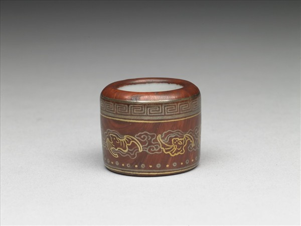瓷扳指,外壁以黑、褐色彩釉繪製地紋,以摹仿木質紋理,其上再以金銀彩繪線描雲蝠紋、回紋及圈點紋,以仿嵌金銀絲的效果;內壁以硃紅篆書「乾隆年製」橫向單行四字款。中瓷4376-中瓷4393之各式扳指同儲於木匣中。乾隆官窯燒造的各類釉彩、各種形制及各式紋樣在造辦處中皆有檔案可追查,特別是釉彩一項,於歷年往返的文書中,透露出御窯廠同時生產與前朝風格相似及不同的作品。加上雍正六年至乾隆二十一年(1728-1756)以前,御窯廠的實際負責人皆為唐英,故從雍正、乾隆兩朝傳世品的異同中,頗能觀察出乾隆加諸官窯的影響,在他不定時的指導、參與之下,乾隆官窯創作出一種集大成的品味。此類作品有如收藏於北京故宮博物院的「各類釉彩瓷瓶」,以及此處的各種釉彩扳指,它們的尺寸雖有大、小的差異,功能亦有陳設和實用的不同,然而極致地表現追摹、仿燒的能力,最後將之改頭換面、再作包裝,正是乾隆官窯力圖誇耀技術、逞現能力的具體說明。