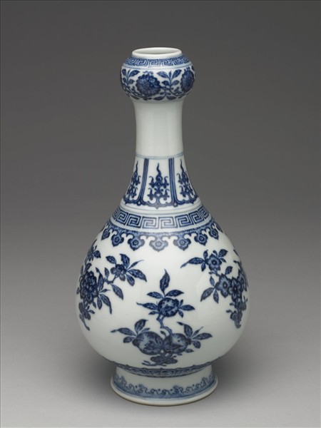 蒜頭瓶,蒜頭口,長頸,斜肩,垂腹,圈足。以青花為飾,腹部繪折枝梅花、茶花與菊花,以及桃、石榴與佛手等花果六組,下皆襯有一對靈芝,上下各有一圈如意雲紋及蓮瓣紋邊飾;口部飾一周回紋與轉枝菊花紋,頸部上段空白,下段繪蓮瓣紋及回紋,圈足外有波濤紋一圈。圈足緣露胎,呈白色,外底中心以青花書「大清乾隆年製」六字三行篆款。