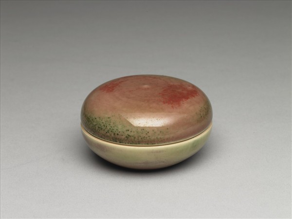 扁圓形盒,子母口,凹足。器裡施透明釉,器表罩施銅紅釉,蓋之呈色較深且偏紅,而器壁呈色較淺而偏綠,釉表出現或紅或綠,深淺不同的苔點。足底露胎,底外白地青花書「大清康熙年製」三行六字楷款。此器一式十件,同儲於一木盒。