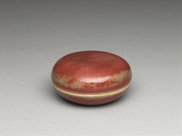扁圓形盒,子母口,凹足。器裡施透明釉,器表罩施豇豆紅釉,形成口緣處較淺,中央較深的淡紅,釉表出現深淺不同的苔點。足底露胎,底外白地青花書「大清康熙年製」三行六字楷款。此器一式十件,同儲於一木盒。
