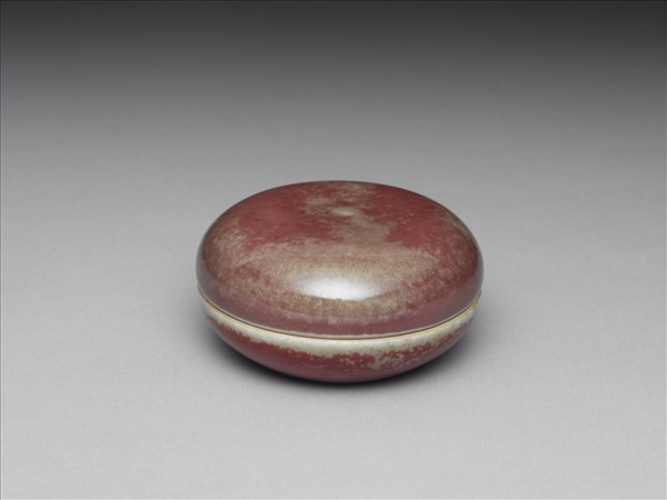 扁圓形盒,子母口,凹足。器裡施透明釉,器表罩施銅紅釉,呈偏紫的紅色,釉表出現或紅或綠,深淺不同的苔點。足底露胎,底外白地青花書「大清康熙年製」三行六字楷款。此器一式十件,同儲於一木盒。