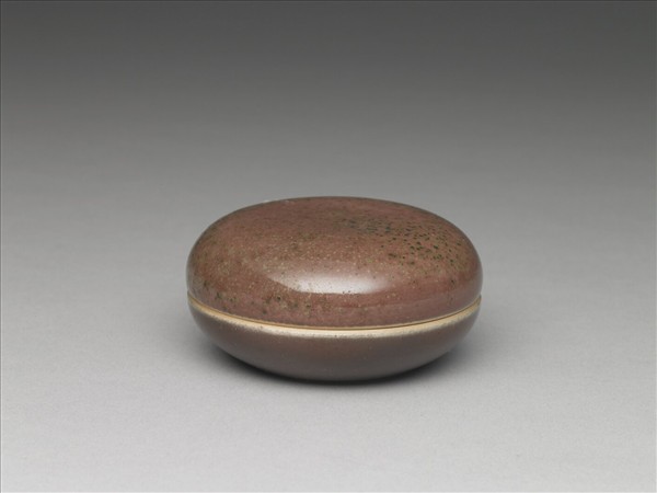 扁圓形盒,子母口,矮圈足。器裡透明釉,器壁滿施銅紅釉,盒蓋釉色散布綠、黑色斑點。圈足內白地青花書「大清康熙年製」三行六字楷款。