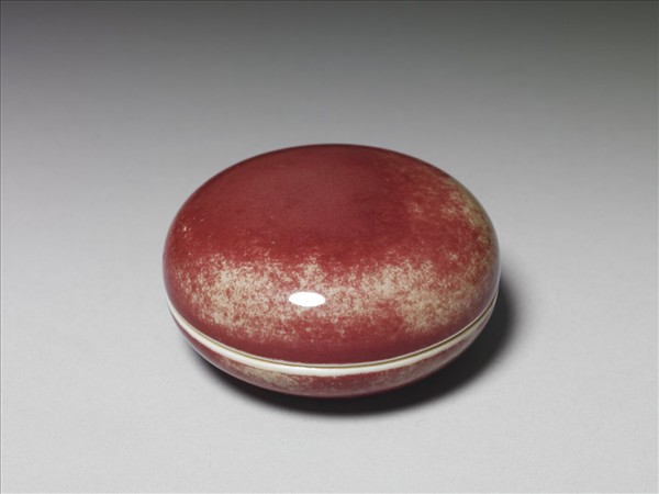 扁圓形盒,子母口,底坐於圈足上。器裡透明釉,器壁滿施銅紅釉,見有大片淺綠色斑。圈足內白地青花書「大清康熙年製」三行六字楷款。