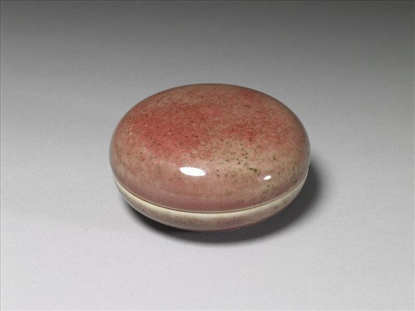 扁圓形盒,子母口,底坐於圈足上。器裡透明釉,器壁滿施銅紅釉,呈色較淡,間綠色斑。圈足內白地青花書「大清康熙年製」三行六字楷款。
