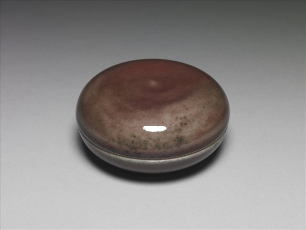 扁圓形盒,子母口,底坐於圈足上。器裡透明釉,器壁滿施銅紅釉,釉色暗而不勻,釉色淺處見有綠色斑。圈足內白地青花書「大清康熙年製」三行六字楷款。