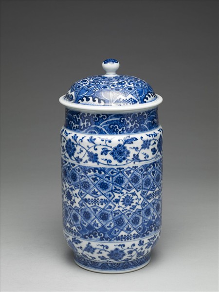 斂口,短頸,長腹,矮圈足,帶圓頂蓋。胎質較厚,通體白釉。頸上青花書波濤紋。腹部中段畫錦格紋,加畫番蓮、波濤等紋飾,上下分畫纏枝番蓮花。足畫雲頭紋,加飾花瓣。蓋面滿畫錦格紋,加畫番蓮波濤等紋飾。