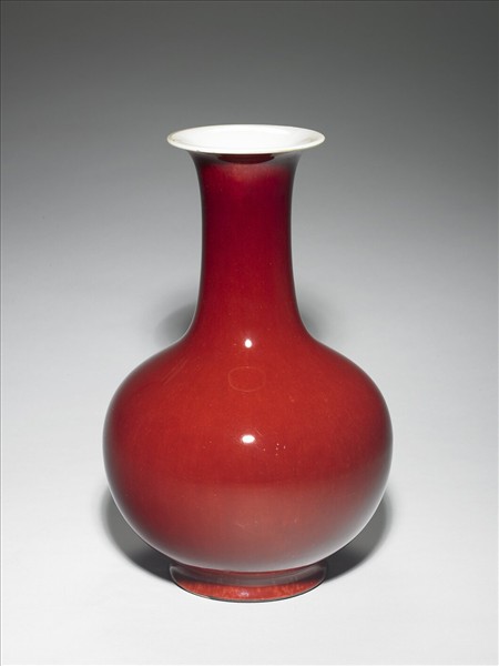 撇口,長頸,圓腹,圈足。器內及底施透明釉,器表施銅紅釉,釉面瑩亮。足端露胎,呈赭色汁,底部印有「大清乾隆年製」六字三行篆書款。