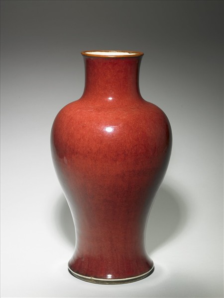 廣圓口微撇,寬頸,圓肩,斂腹,長身,細脛,下端內收後外撇,凹足。器內與底施透明釉,器表施銅紅釉,釉面有暗紅色苔斑,口沿因流釉呈色稍淺。足端露胎,口沿似經截切,鑲窄邊銅釦。