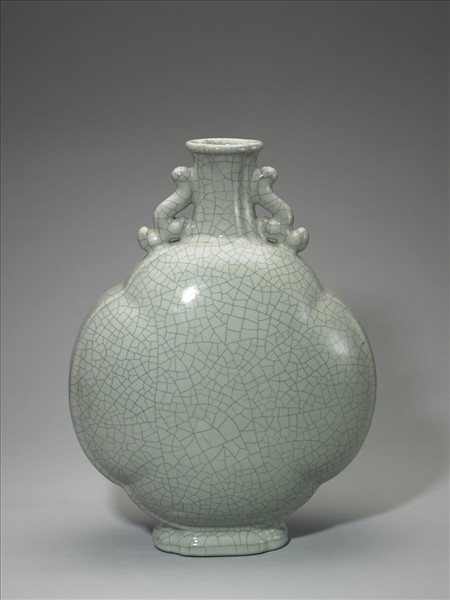 海棠型扁壺,海棠形口,圓唇,短頸,有四凹倰,雙耳,海棠形腹,周邊較扁,中央較凸;海棠形圈足。全器施灰青釉,釉面佈滿開片紋,紋線以人工處理成灰黑色。足底緣露胎,施加鐵汁,燒成後呈褐色足。底以青花書「大清雍正年製」三行六字篆款。