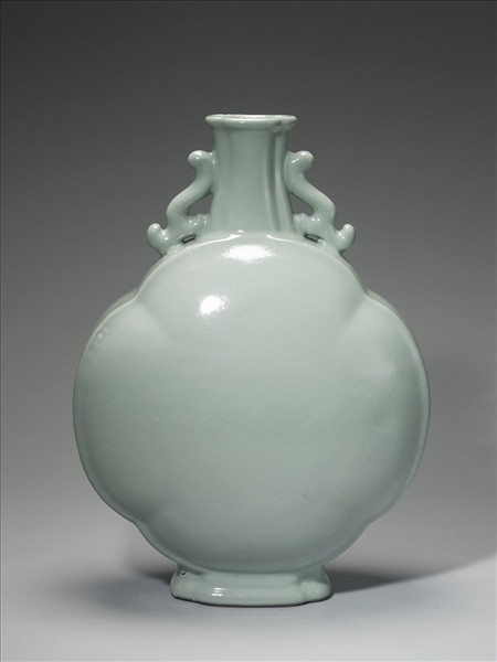 海棠型扁壺,海棠形口,圓唇,短頸,有四凹倰,雙耳,海棠形腹,周邊較扁,中央較凸;海棠形圈足。全器施仿汝青瓷釉,釉色均勻圓潤。足底緣露胎,施鐵汁,燒成後呈褐色。底以青花書「大清雍正年製」三行六字篆款。