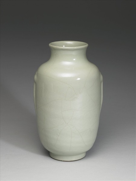 圓口微撇,短頸,碩腹,腹上帶綬帶形暗耳一對,圈足。通體施灰綠色釉,面有極稀疏淺色開片紋。圈足露胎塗棕色汁,器底青花書「大清雍正年製」三行六字篆款。