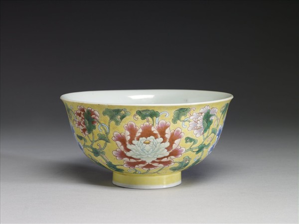 侈口微撇,弧形壁,圈足。外壁施黃釉為地,繪五彩纏枝牡丹,內壁白釉。圈足露白胎,足內白釉,中青花書「康熙御製」四字楷款,加雙方框。與中瓷4488一式成對。