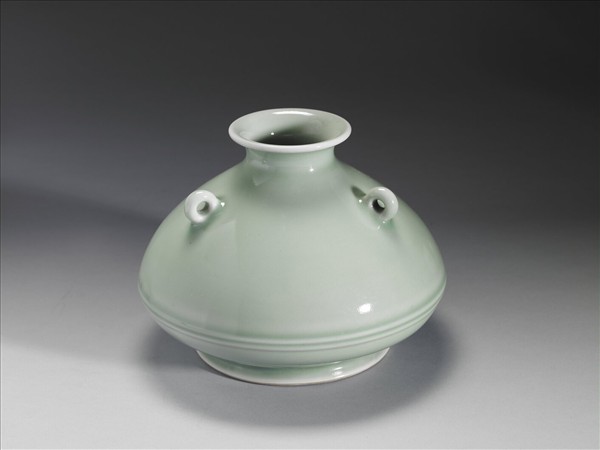 小口外撇,短頸,削肩,夸腹,圈足,肩上帶豎形小環耳三。通體施豆青釉,清淺光亮,腹部有弦紋二周,近足處貼飾蓮瓣紋二重。圈足露白胎,底心寫「大清雍正年製」三行六字青花篆款。