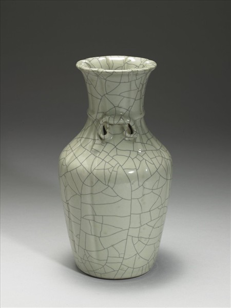 瓶圓身有八稜紋,撇口,收腰頸,削肩,碩腹,平底,頸上貼飾繫結繩一道。通體施青釉,色青灰光亮,滿佈鐵灰色開片紋。圈足露胎塗棕色汁,器底青花書「大清乾隆年製」三行六字篆款。