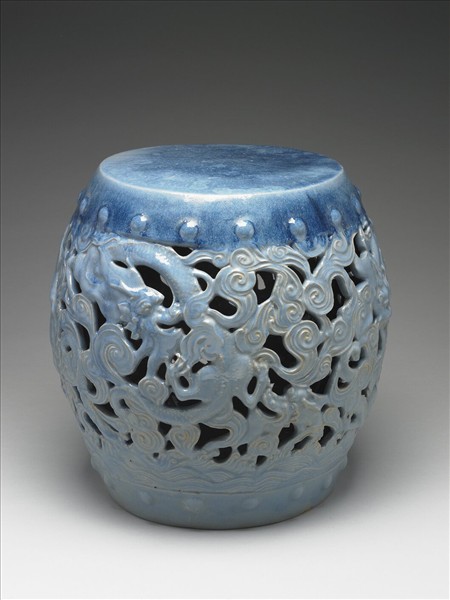 鼓狀瓷墩,座面平,腹中段外鼓,平底,中空,腹壁上緣與下緣均作鼓釘狀凸起,中段鏤空雕飾雙龍紋於水波雲紋之間。全器施鈞釉系乳濁狀藍釉,釉色流動,頂面色較深。底面僅環形器緣露胎,中空,未見款識。