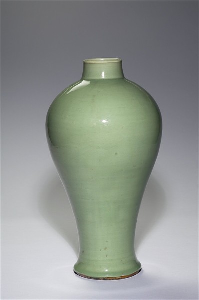 小口,短頸,豐肩,碩腹下斂,淺圈足。通體施青釉,釉色青翠光潤,通體光素無紋。圈足露胎,塗赭色汁。