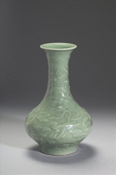 撇口,直長頸,夸腹,平底,淺圈足。通體施青釉,色淡綠瑩潤,器身堆拱龍、蝠、火焰、祥雲,底邊作水波紋。圈足露白胎,器底鈐印「大清嘉慶年製」三行六字篆款。