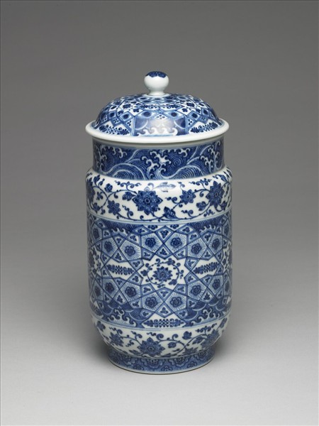 帶蓋白地青花瓷罐,圓口,直頸,折肩,肩甚窄,直腹如筒,圈足。頸部波濤紋。外壁上下各飾一帶纏枝花卉,中央部分等距裝飾數個角星,角星之中繪卷枝花,並將角星外廓直線分別延長,彼此交錯分割出各式幾何區塊,並於幾何區塊中各自填飾大小花卉、葉片、波濤紋。足牆繪飾半邊盛開花朵,其順次排列如覆蓮瓣。蓋外壁裝飾概念與外壁類同,都是以中心向外分割輻出各式幾何形區塊,並以花卉、波濤填飾其中。由其器形與紋樣看來,顯然是模仿自明代初年的青花瓷器(現藏於北京故宮,品名為〈青花錦紋壯罐〉)。學者曾進一步論及這種器形的來源,推定源頭可以追溯至伊斯蘭陶瓷。除此之外,若將其外壁主紋飾與十四世紀敘利亞馬木路克王朝時期〈玻璃金彩唾壺〉外壁紋飾相較,就會發現其裝飾概念類同,特別是〈玻璃金彩唾壺〉幾何區塊中填飾的如花似葉的小紋樣,同見於本器與北京故宮藏品。如此一來,我們就可以瞭解本器樣式、紋飾所模仿的對象與源流,實是明代初年受外國影響所製作的作品。本器雖然無款,但是院藏中見有帶「大清乾隆年製」款的類似作品(典藏號:中瓷5493),且紋飾、釉色高度相似,或可推定本器當製作於清代乾隆朝。