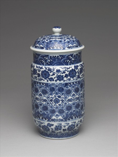 帶蓋白地青花瓷罐,圓口,直頸,折肩,肩甚窄,直腹如筒,圈足。頸部波濤紋。外壁上下各飾一帶纏枝花卉,中央部分等距裝飾數個角星,角星之中繪卷枝花,並將角星外廓直線分別延長,彼此交錯分割出各式幾何區塊,並於幾何區塊中各自填飾大小花卉、葉片、波濤紋。足牆繪飾半邊盛開花朵,其順次排列如覆蓮瓣。蓋外壁裝飾概念與外壁類同,都是以中心向外分割輻出各式幾何形區塊,並以花卉、波濤填飾其中。由其器形與紋樣看來,顯然是模仿自明代初年的青花瓷器(現藏於北京故宮,品名為〈青花錦紋壯罐〉)。學者曾進一步論及這種器形的來源,推定源頭可以追溯至伊斯蘭陶瓷。除此之外,若將其外壁主紋飾與十四世紀敘利亞馬木路克王朝時期〈玻璃金彩唾壺〉外壁紋飾相較,就會發現其裝飾概念類同,特別是〈玻璃金彩唾壺〉幾何區塊中填飾的如花似葉的小紋樣,同見於本器與北京故宮藏品。如此一來,我們就可以瞭解本器樣式、紋飾所模仿的對象與源流,實是明代初年受外國影響所製作的作品。本器雖然無款,但是院藏中見有帶「大清乾隆年製」款的類似作品(典藏號:中瓷5493),且紋飾、釉色高度相似,或可推定本器當製作於清代乾隆朝。