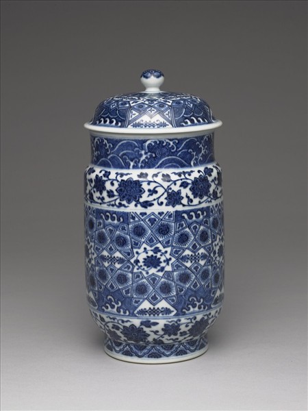 斂口,短頸,長腹,矮圈足,帶圓頂蓋。胎質較厚,通體白釉。頸上青花書波濤紋。腹部中段畫錦格紋,加畫番蓮、波濤等紋飾,上下分畫纏枝番蓮花。足畫雲頭紋,加飾花瓣。蓋面滿畫錦格紋,加畫番蓮波濤等紋飾。