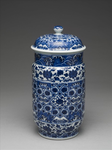 斂口,短頸,長腹,矮圈足,帶圓頂蓋。胎質較厚,通體白釉。頸上青花書波濤紋。腹部中段畫錦格紋,加畫番蓮、波濤等紋飾,上下分畫纏枝番蓮花。足畫雲頭紋,加飾花瓣。蓋面滿畫錦格紋,加畫番蓮波濤等紋飾。