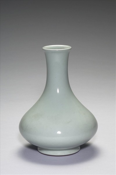 直口,長頸,溜肩,扁圓廣腹,矮圈足。全器施冬青釉,釉面微見淺色開片紋。足緣呈深褐色,底書「大清乾隆年製」青花六字三行篆書款。