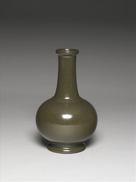 直口,口沿凸起一道唇邊,豎邊,長頸,圓碩腹,矮圈足略外撇。全器施茶葉末釉,呈橄欖綠色,釉面光滑。圈足底緣呈深褐色,底施茶葉末釉,模印「大清乾隆年製」六字三行篆書款。