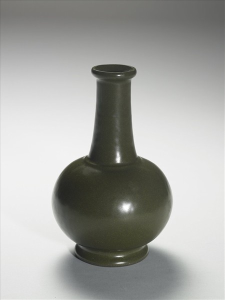直口,口沿凸起一道唇邊,豎邊,長頸,圓碩腹,矮圈足略外撇。全器施茶葉末釉,呈深綠色,釉面光滑。圈足底緣呈深褐色,底施茶葉末釉,模印「大清乾隆年製」六字三行篆書款。