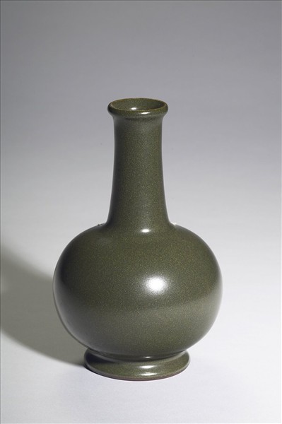直口,口沿凸起一道唇邊,豎邊,長頸,圓碩腹,矮圈足略外撇。全器施茶葉末釉,呈深綠色,釉面光滑,口沿釉薄呈淺棕色。圈足底緣呈深褐色,底施茶葉末釉,模印「大清乾隆年製」六字三行篆書款。
