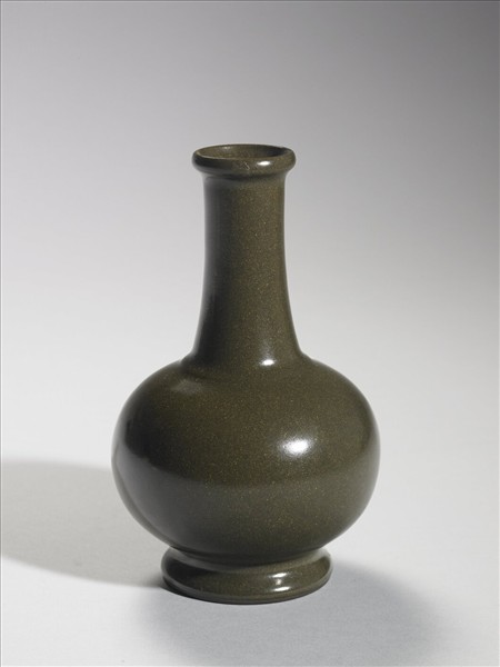 直口,口沿凸起一道唇邊,豎邊,長頸,圓碩腹,矮圈足略外撇。全器施茶葉末釉,呈橄欖綠色,釉面光滑。圈足底緣呈深褐色,底施茶葉末釉,模印「大清乾隆年製」六字三行篆書款。