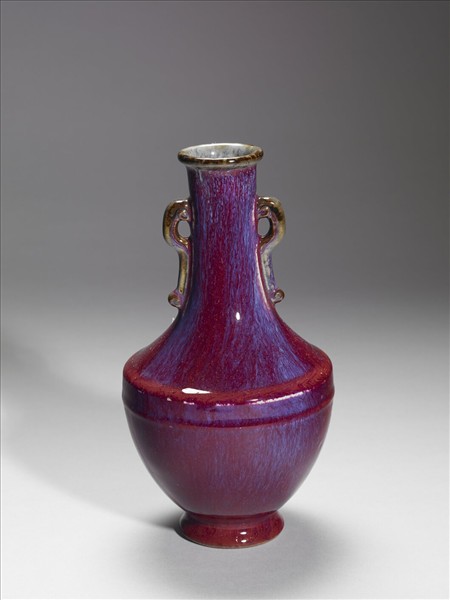 唇口,長頸,雙耳,溜肩,碩腹下斂,撇足。通體施爐鈞釉,呈紅、靛、紫等多色深淺混雜流動,口內與雲形板耳一對則多作淺藍色。器底施醬釉,中鈐「大清乾隆年製」篆款,圈足露胎,塗赭色汁。