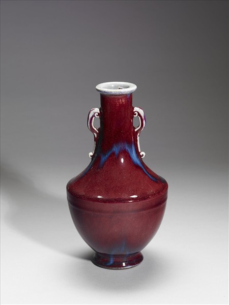 唇口,長頸,雙耳,溜肩,碩腹下歛,撇足。通體施爐鈞釉,呈以火紅為主,兼帶靛、紫等多色深淺混雜流動,口內與雲形板耳一對則多作淺藍色。器底施醬釉,中鈐「大清乾隆年製」篆款,圈足露胎,塗赭色汁。