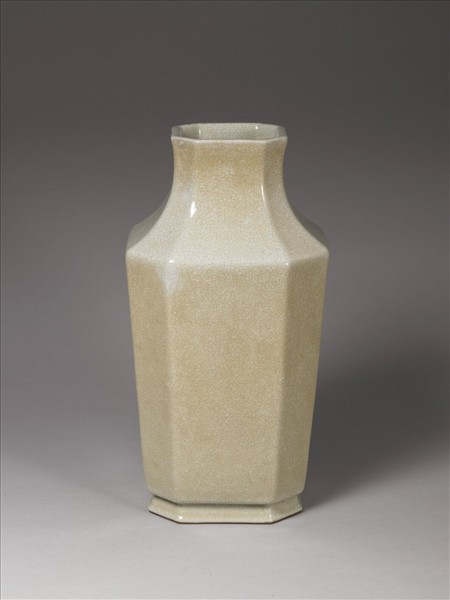 直口微撇,短頸,斜肩,直腹,圈足,全器作八方形。通體施灰青仿哥釉,釉色灰青,釉面滿佈細碎褐色開片紋。圈足露胎,塗棕色汁,底心有「大清乾隆年製」青花篆款。