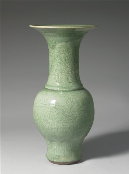 大瓶,喇叭狀寬撇口,長頸,寬圓肩,腹上部豐圓,脛部束斂直下,圈足。全器施青釉,外壁通體刻花紋飾,頸腹各飾轉枝牡丹紋,底邊直線紋,口足底邊加飾弦紋數道,胎體厚重,釉面有大小開片紋,圈足露胎,修飾不勻,略粗,無款。