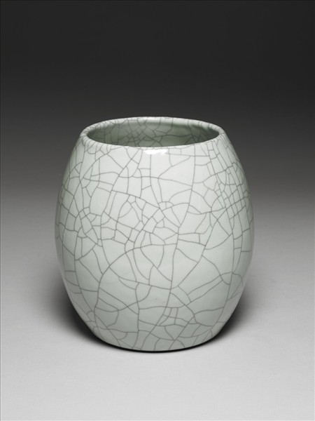 寬斂口,卯形器身,碩腹,深弧壁,足內挖,底寬平。整器內外施灰青哥釉,釉色白淨,其上並見清晰黑色開片紋。足端露胎一圈塗褐色汁,底有青花書「大清乾隆年製」三行六字篆款。