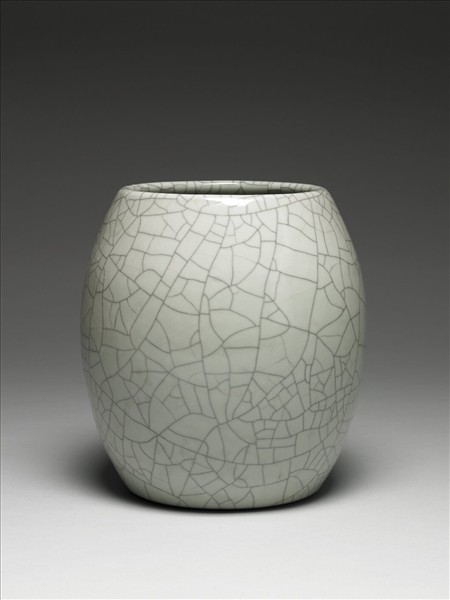 寬斂口,卯形器身,碩腹,深弧壁,足內挖,底寬平。整器內外施灰青哥釉,釉色白淨,其上並見清晰黑色開片紋。足端露胎一圈塗褐色汁,底有青花書「大清乾隆年製」三行六字篆款。