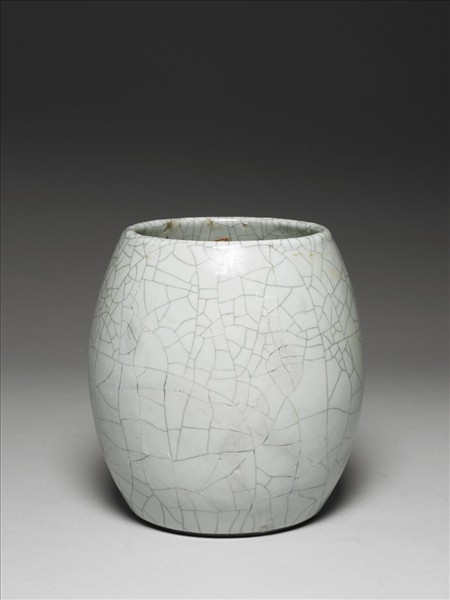 寬斂口,卯形器身,碩腹,深弧壁,足內挖,底寬平。整器內外施灰青哥釉,釉色白淨,其上並見清晰黑色開片紋。足端露胎一圈塗褐色汁,底有青花書「大清乾隆年製」三行六字篆款。但器有多處碎裂傷補。