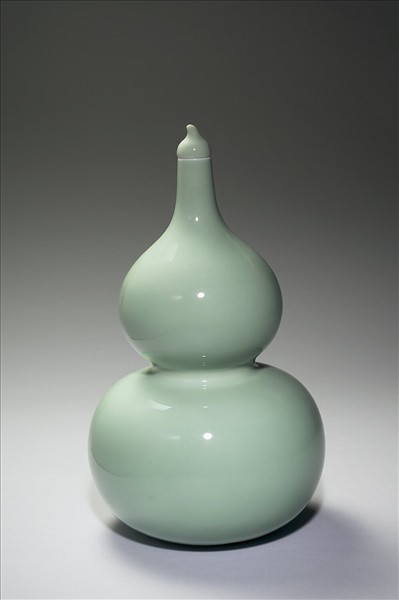器作葫蘆形,小口,平底,凹足,帶小蓋。全器施罩冬青釉,釉色勻淨瑩潤,底足一圈呈環狀露胎無釉,底心青花書寫「大清乾隆年製」三行六字篆款。