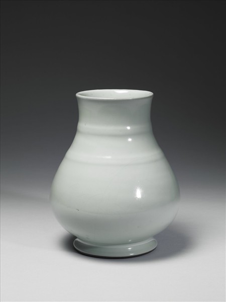 器仿古銅壺形,敞口,收頸,碩腹,圈足外撇。通體施仿汝釉,灰青勻亮,略偏藍色調,頸上起闊線弦紋二道。圈足露胎,塗為赭色,底青花書「大清雍正年製」三行六字篆款。