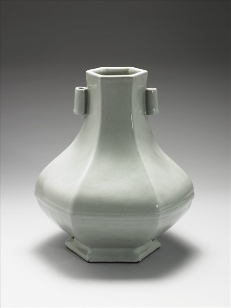 全器俱作六邊形,直口微撇,直頸,雙貫耳,削肩,扁腹,圈足,足上有二橫長方繫孔。通體施仿汝釉,灰綠勻亮,腹部飾凸弦紋二周。圈足露白胎,底青花書「大清雍正年製」三行六字篆款。