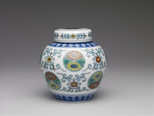 斂圓口,短頸,豐肩,腹部上碩下斂,平底凹足,帶平頂圓蓋。器肩及底邊各繪青花朵花紋飾一周,花心加點紅、黃點紋,罐腹上下各繪飾四團花菊紋、隙地則飾蓮花。蓋面亦飾一團菊花,蓋周則為四組蓮花紋。底青花書「大清乾隆年製」六字三行篆款。