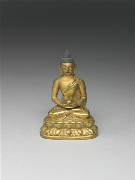 銅鎏金佛坐像,結跏跌坐於蓮座上,手結定印並持缽,面容秀氣平和,面帶微笑;肌理圓潤均勻,著右袒式袈裟,衣袖、下襬寬鬆,與中國服裝寬袍大袖的風格相近。底陰刻十字杵花紋,置於瓷製藏式塔龕內。