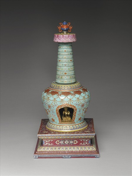 藏式塔,分段燒成後黏合。藍色寶瓶頂,粉紅寶蓋;塔身為湖綠地鉤邊彩繪番蓮紋及朵花紋,並繪獸面與瓔珞紋,龕門以卷葉紋框邊,龕底飾蓮瓣紋;須彌方座,飾紫紅色地鉤邊彩繪卷枝番蓮紋及朵花紋,轉折飾蓮瓣紋,下緣仿繪如意雲足;座足底露胎,底內凹施湖藍釉,中央有圓孔,可見圓形湖藍釉塔底。塔內置一銅鎏金佛像。